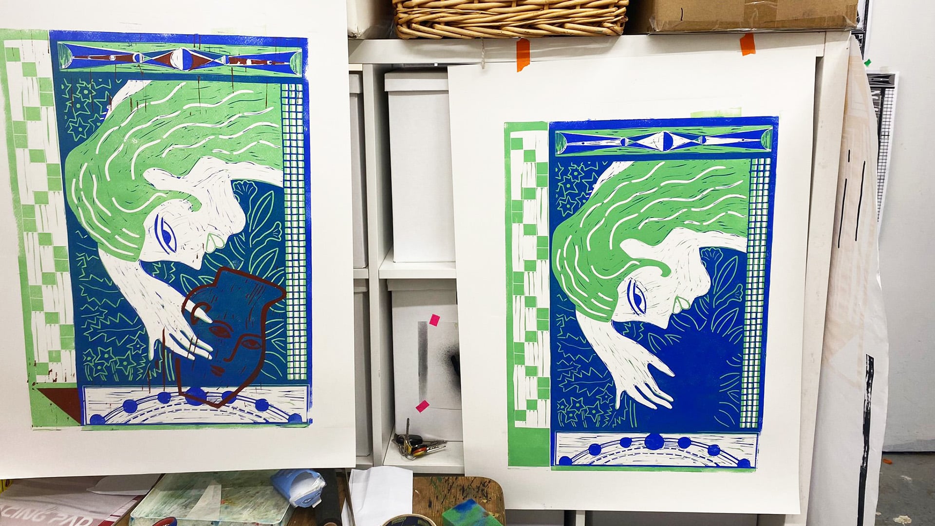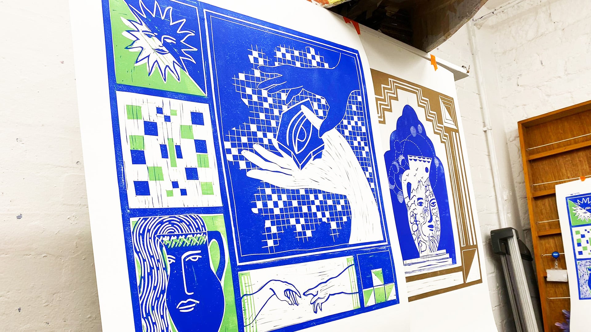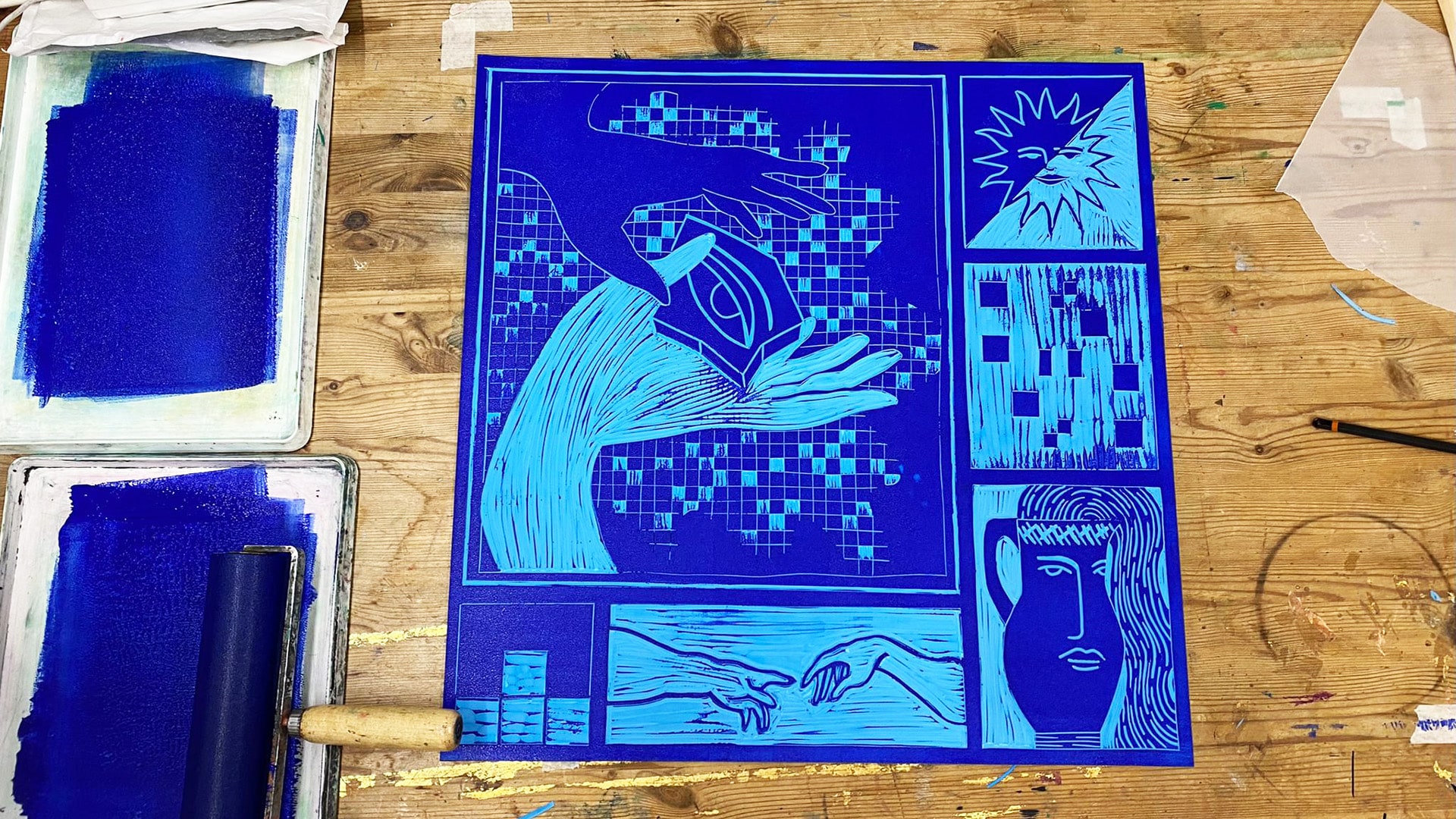 The artists went on to develop ideas for the artwork based on key themes that emerged from the consultations with staff, families and patients. Recurring themes included ‘repair’, feelings of ‘hope’ and ‘building connections’. Poet Zayneb was inspired to explore‘Kintsugi’, the Japanese art of repairing broken pottery by mending the areas of breakage – often with a lacquer dusted with powdered gold. She went on to produce a moving poem called ‘The Art of Repair’ encapsulating the themes of hope, care and repair. Visual artist and printmaker Colette in response to the poem incorporated ‘Kintsugi’ in the form of gold leaf into her handmade artworks, with the addition of miniature figures building and repairing pots and urns, representing the vital connections and support people accessing the service experience.